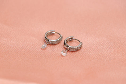 Solitaire Diamond Studded Silver Hoop Earrings